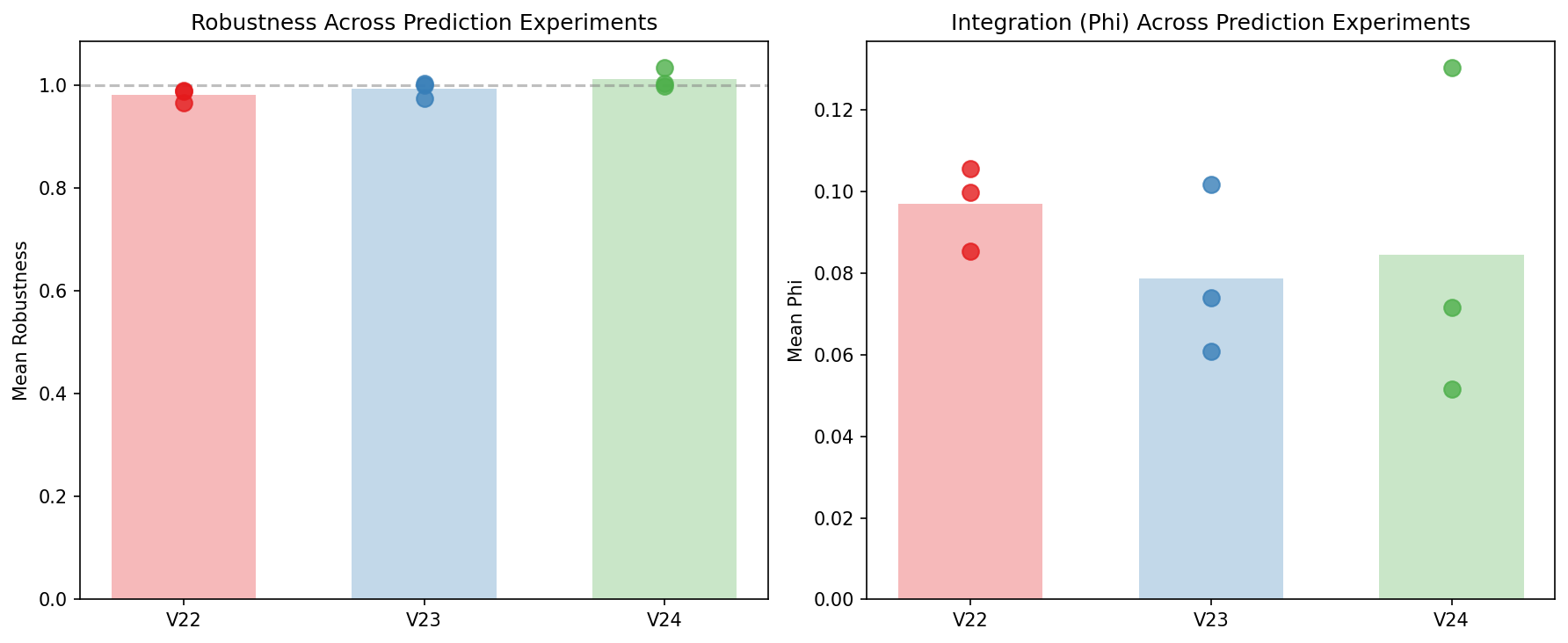 V24 evolution trajectories. Top-left: robustness with dramatic spikes at drought boundaries (up to 1.5) — the highest transient robustness of any prediction experiment. Top-right: Φ shows the widest variance (0.02–0.25), with seed 7 reaching high values mid-evolution before declining. Bottom-left: population dynamics. Bottom-right: TD error decreases over evolution — value learning works, but doesn't force integration because the linear readout is decomposable.V22–V24 prediction experiment comparison. Left: mean robustness. V24 (TD value) achieves the highest (~1.01), crossing the 1.0 threshold. V22 and V23 cluster below 1.0. Right: mean Φ. All three experiments overlap in the 0.06–0.10 range with high per-seed variance. Individual seed dots show no experiment consistently outperforms the others. The prediction target (scalar energy, multi-target, temporal value) does not reliably change integration — only architecture does (see V27).